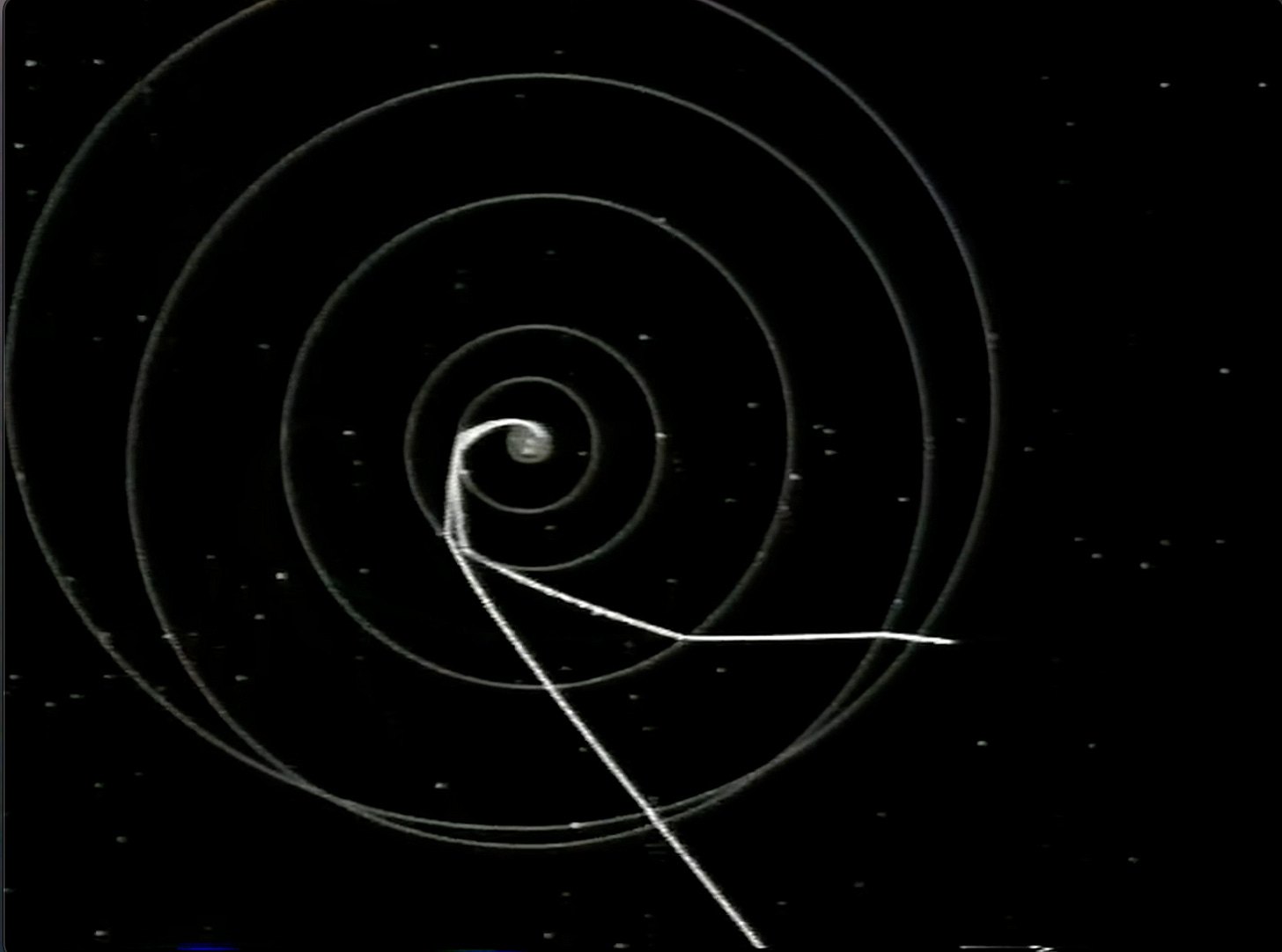 Produced in 1977 to illustrate the trajectories of “twin” spacecraft, Voyagers 1 and 2, the animation has a video game quality that begins with a god’s-eye view looking down on (at the time) nine planets circling a star. The angle changes, zooming in closer to the orbital plane to focus on the three dots closest to the sun. Two white lines zoom away from the Earth dot and head toward Jupiter. Voyager 1 gets there first at the beginning of 1979, even though it was the second of the craft to launch, flung into space on September 5, 1977, just 16 days after its sibling, which arrived at Jupiter a few months later.