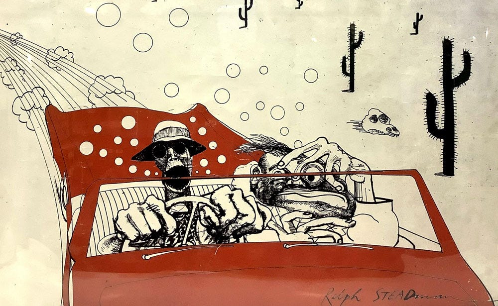 Like a Ralph Steadman ink explosion, I often imagined myself sun-glassed and big-headed in a car racing away from a town on fire.